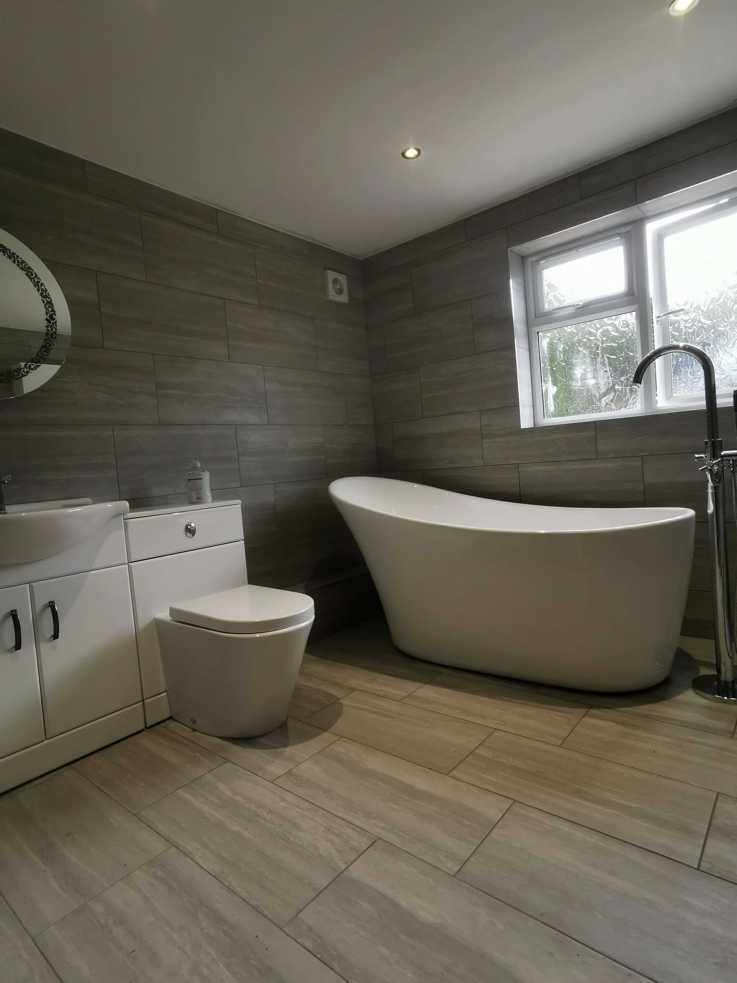 Garage conversion carried out into a fully porcelain tiled bathroom, with slipper bath.